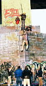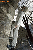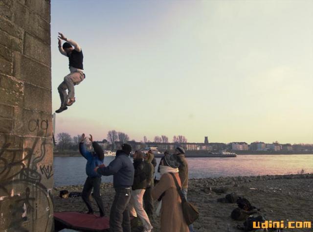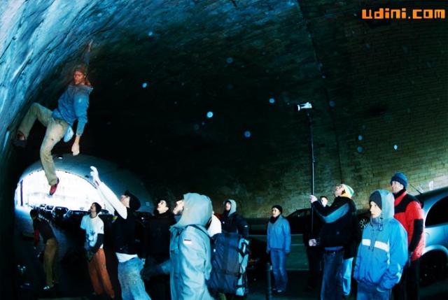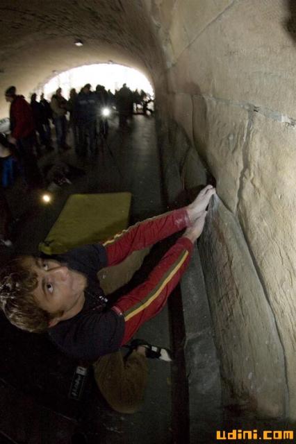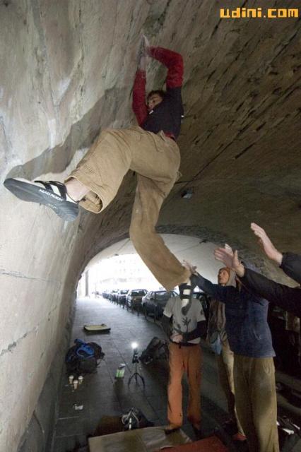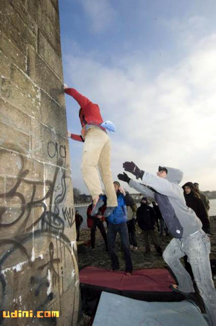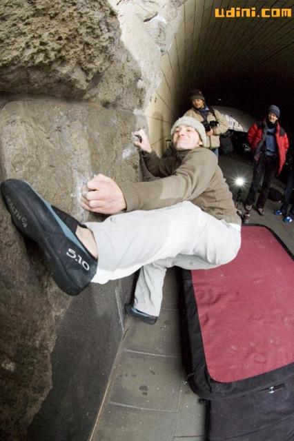 Но не все участники пробовали себя на скоростной трассе. Слишком велико очарование дверью в стене, которую нужно преодолеть без рук. За все время пребывания на Цообрюкке здесь собирается большая толпа желающих решить эту задачу, что, в конце концов, никому не удается. Когда пора двигаться дальше, немецкого чемпиона 2004 г., Daniel’a Jung’a едва удается отговорить продолжать пробовать эту проблему с футуристическими движениями. После прогулки до зоопарка и короткой поездки на трамвае участники в полном составе появляются в последнем пункте назначения, у моста Мюльгеймер . И, несмотря на леденящий холод, на старте все еще довольно много зрителей. Наряду с несколькими простыми болдеринговыми проблемами особое внимание зрителей привлекает до сих не опробованный, 6-метровый кант. Также и здесь Benki окончательно дает понять, что может быть только один чемпион билдеринга. Он великолепно пролезает флэшем кант, а затем лезет еще раз только для фотографий, в то время как большинству участников пришлось пережить маленькие или большие трагедии прежде, чем им удается пройти трассу. Только Daniel Jung в соревновательном порыве также пролезает кант с первого раза. Здесь также впечатляюще проявляет себя Ibo Gugnor, всего несколько дней назад примкнувший к группе участников, которому к тому моменту, когда все остальные участники уже капитулировали перед холодом, удается еще одно прохождение канта.